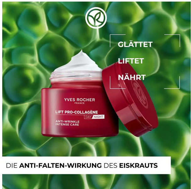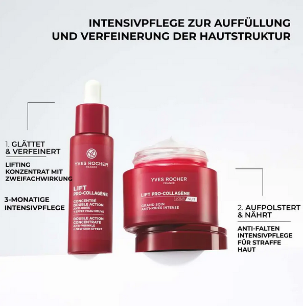 Die Intensivpflege Lift Pro-Collagène gegen Falten ist unser umfassendstes Produkt. Es ist speziell für die Doppelverwendung als Tag- und Nachtcreme bestimmt. Sie reduziert selbst tiefe Falten, sodass die Haut sofortglatter, aufgepolstert und genährt wird.