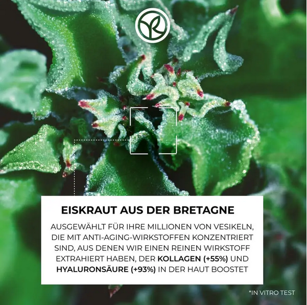 Die Formel mit einer hohen Konzentration* an Eiskraut wirkt in Kombination mit natürlichem pflanzlichem Kollagen und Hyaluronsäure besonders stark gegen Falten.